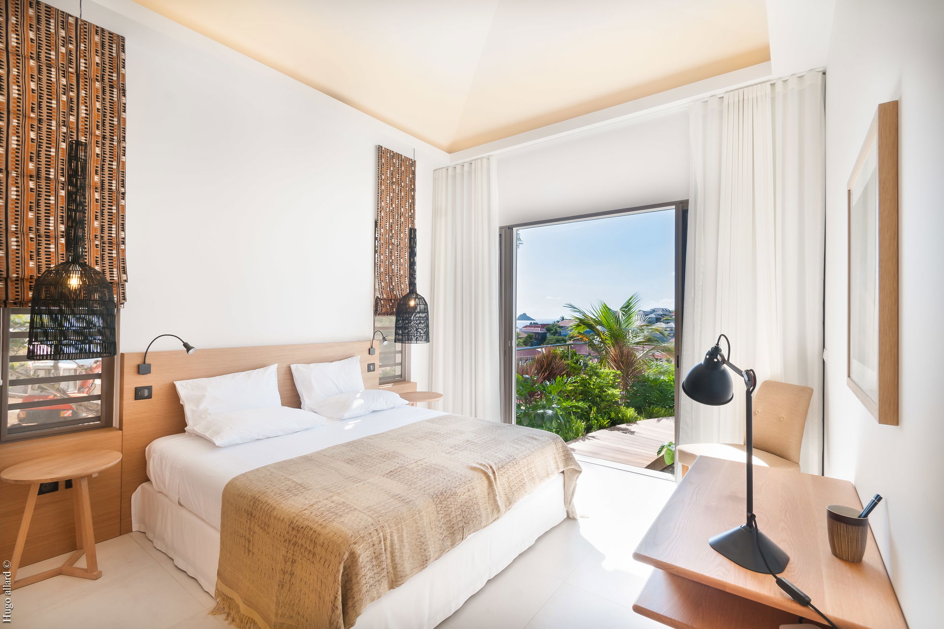 The two bedrooms lie on opposite sides of this central gathering area. Equal in size, they both have ensuite bathrooms, European king beds, glass doors that open directly onto the terrace, and stylish details like birdcage hanging lamps and richly patterned panels flanking the bed.