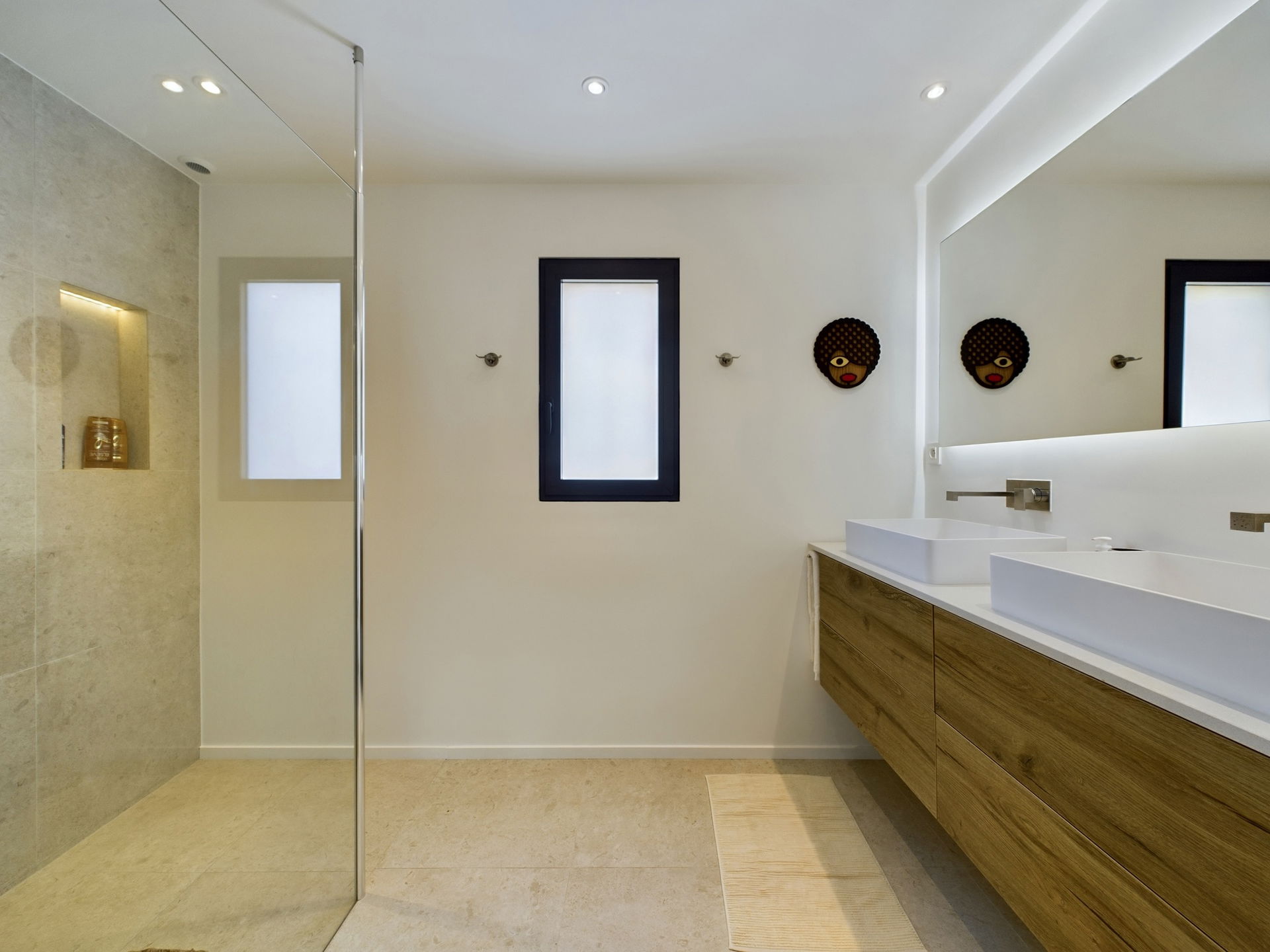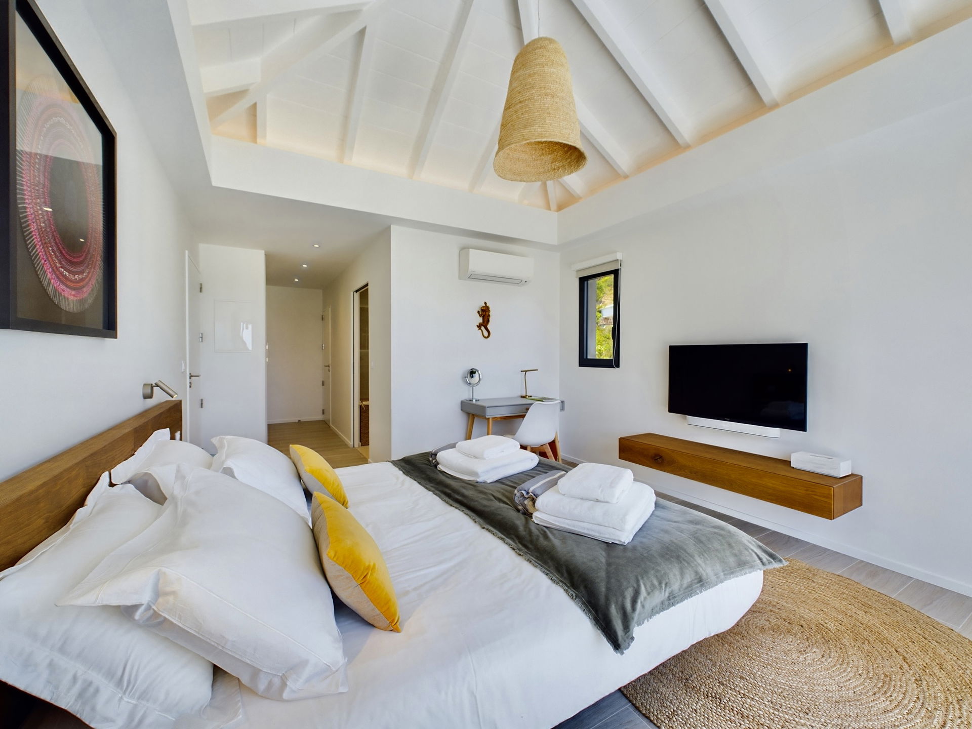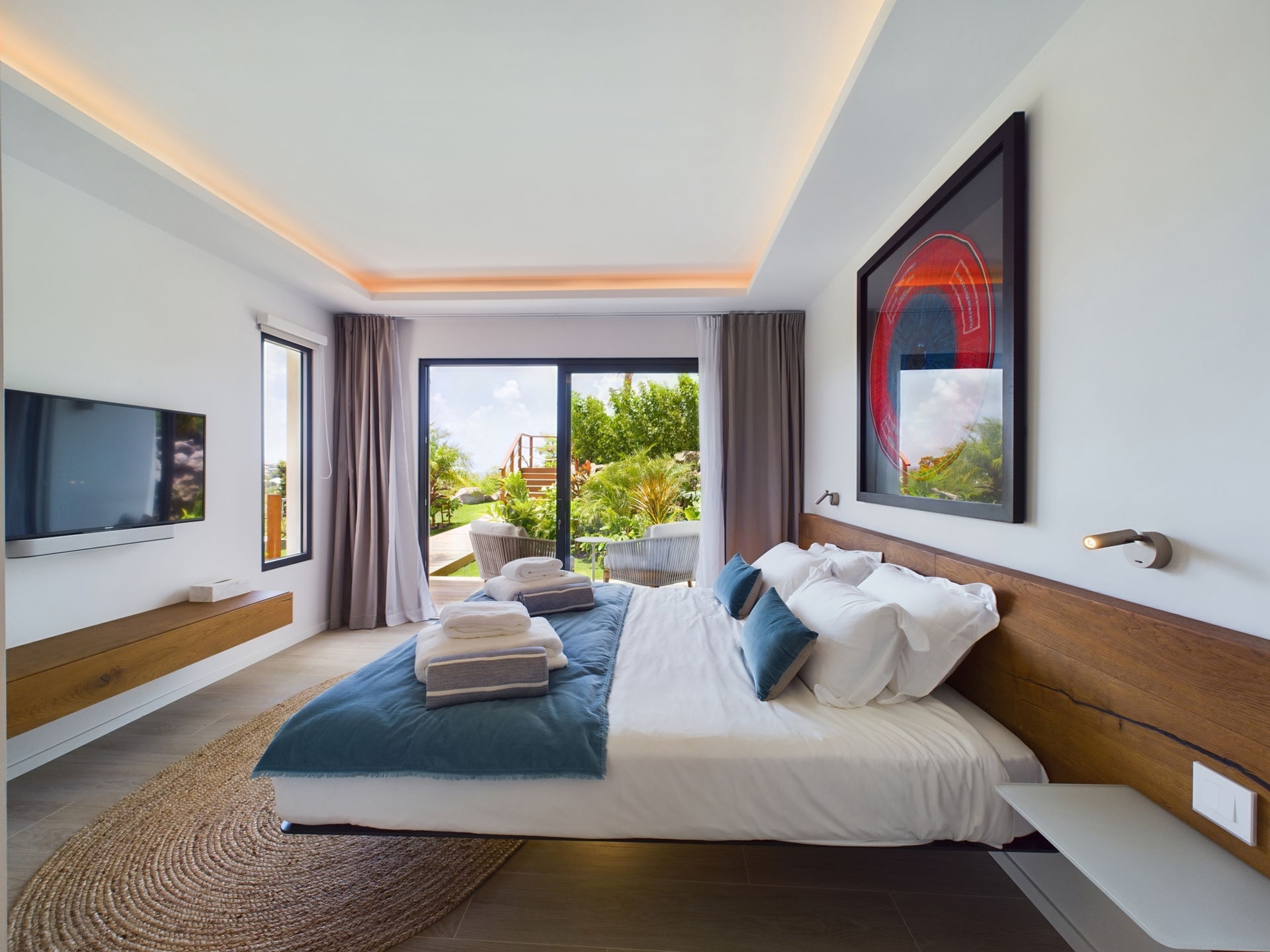 The two main bedrooms are similar in size and located on opposite sides of the living area. Each one has a king-size bed, an ensuite bathroom with a shower, a Smart TV, a dressing area, a sea view, and a small outdoor living space. One of them is a few steps above the main area, while the third bedroom is a full flight of stairs below. This room has the same amenities, except for a partial ocean view and an outdoor space that faces the garden.
